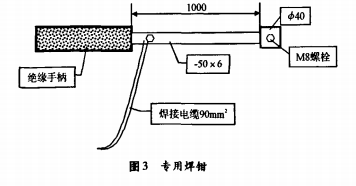 由于焊接時電弧長,溫度較高,焊工操作時要盡可能的遠離工件,因此特制一把專用焊鉗,如圖3。